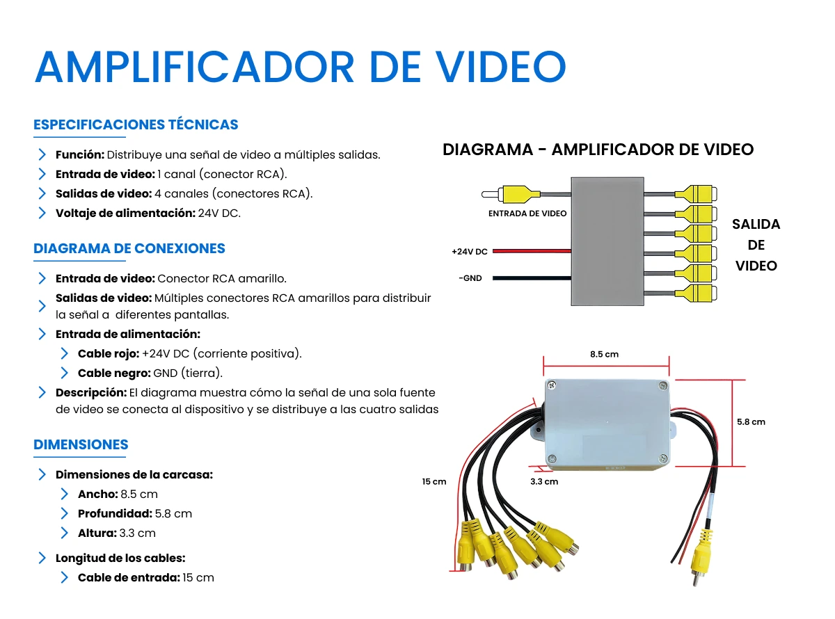 Distribución de señal de video – Amplificador diseñado para enviar una misma señal de video a múltiples monitores en vehículos. Ideal para sistemas de entretenimiento o vigilancia en buses y autos.