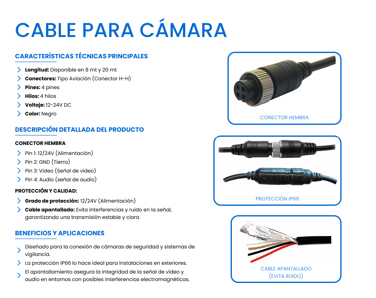 ¡Conexión segura y duradera para tus cámaras! Cable con conector de aviación hembra, ideal para sistemas de vigilancia y vehículos. Resistente, confiable y fácil de instalar. ¡Lleva tu equipo al siguiente nivel!