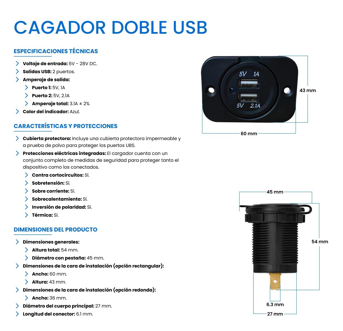 Carga rápida y doble puerto USB – Cargador empotrable ideal para autos, buses y camionetas. Compatible con sistemas de 12V y 24V para alimentar dos dispositivos al mismo tiempo de forma segura y eficiente.