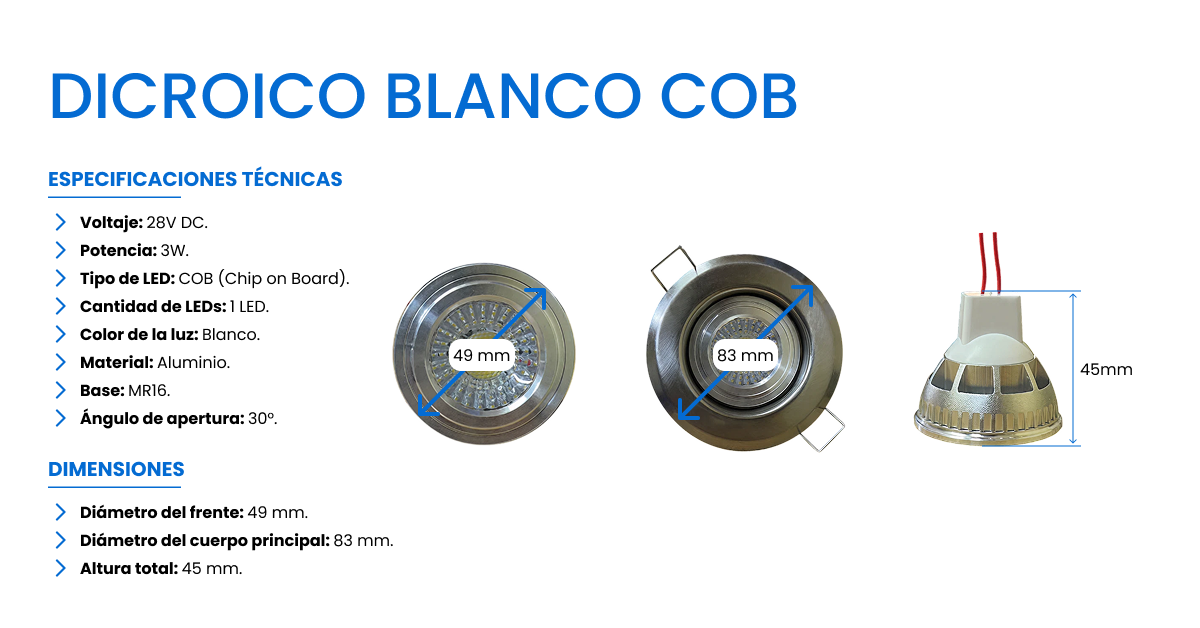 Luz blanca intensa y uniforme – Dicroico COB ideal para iluminación interior en buses, minivans y vehículos. Brinda alto brillo con eficiencia energética y larga duración.