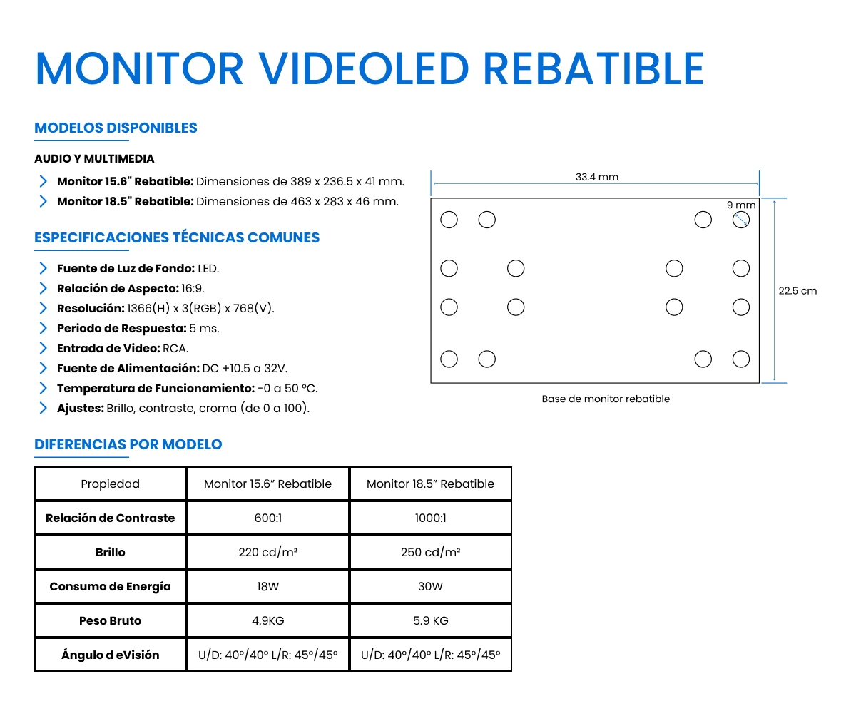 Monitor vehicular LED HD REBATIBLE, cuenta con dos medidas: