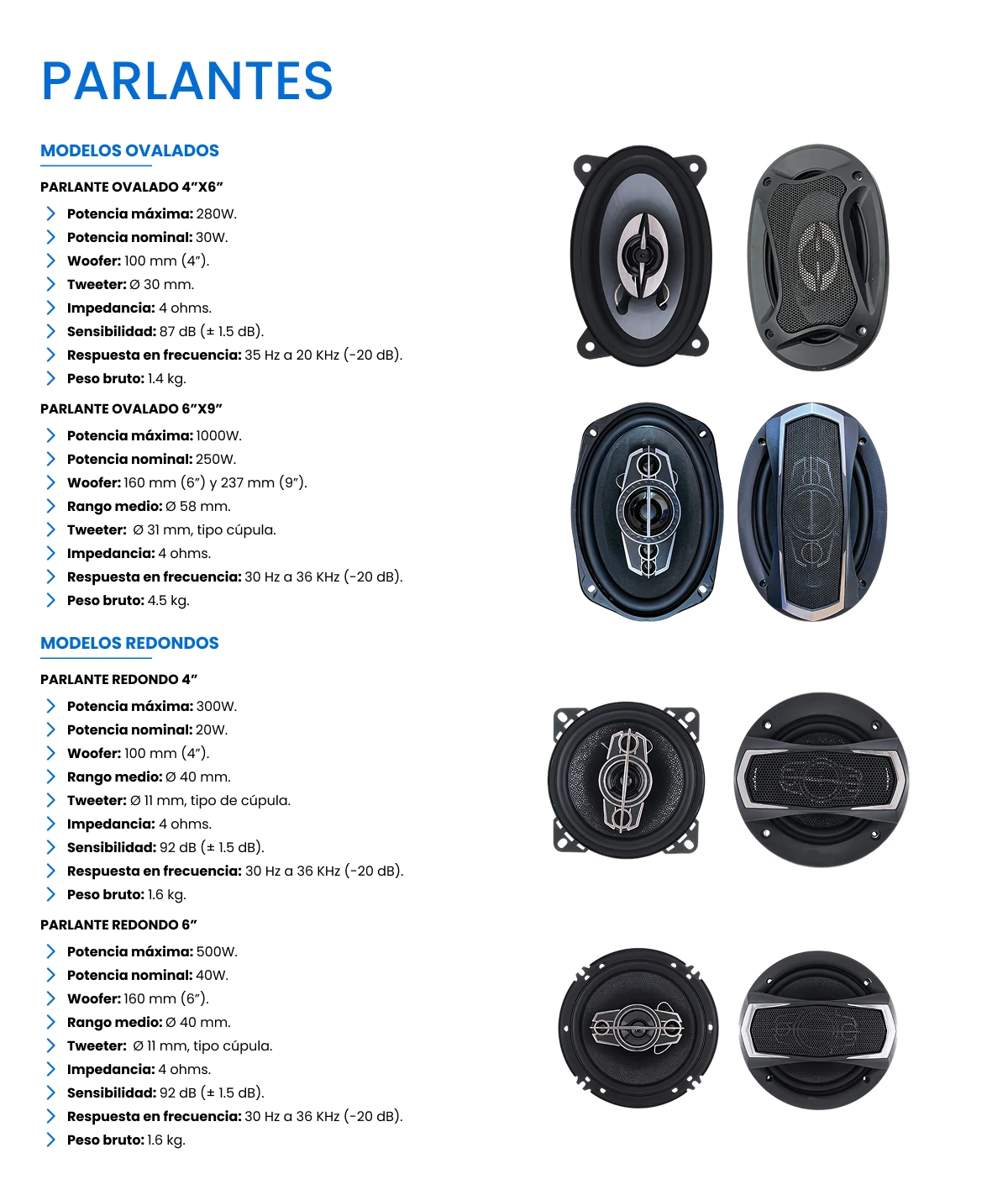 Sonido potente y definido – Parlantes diseñados para vehículos, ideales para mejorar la calidad del audio en buses, autos y minivans. Fácil instalación y excelente rendimiento.