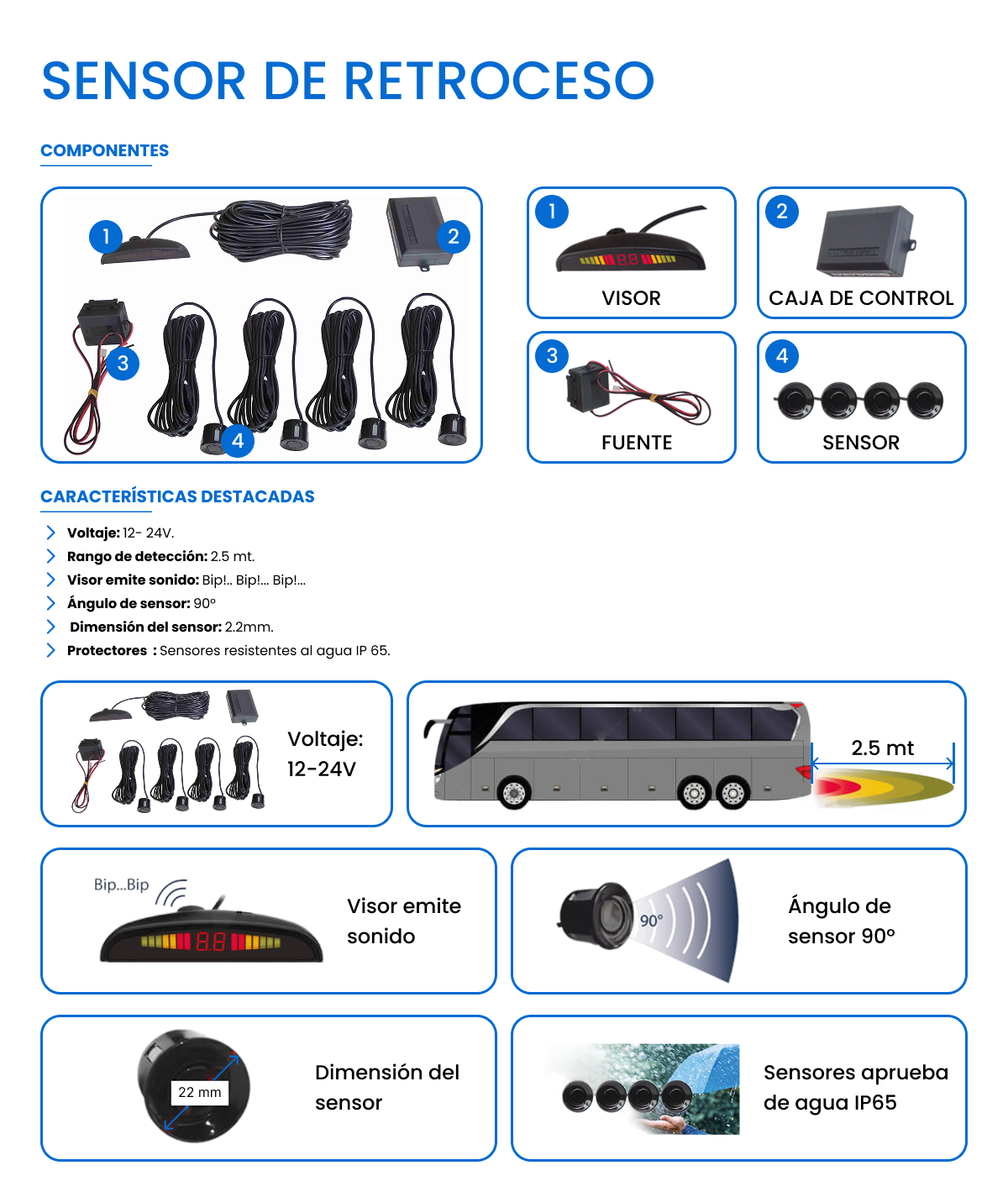 Maniobras seguras y precisas – Sensor de retroceso para buses, minivans y vehículos. Detecta obstáculos al estacionar o retroceder, emitiendo alertas sonoras para evitar colisiones.