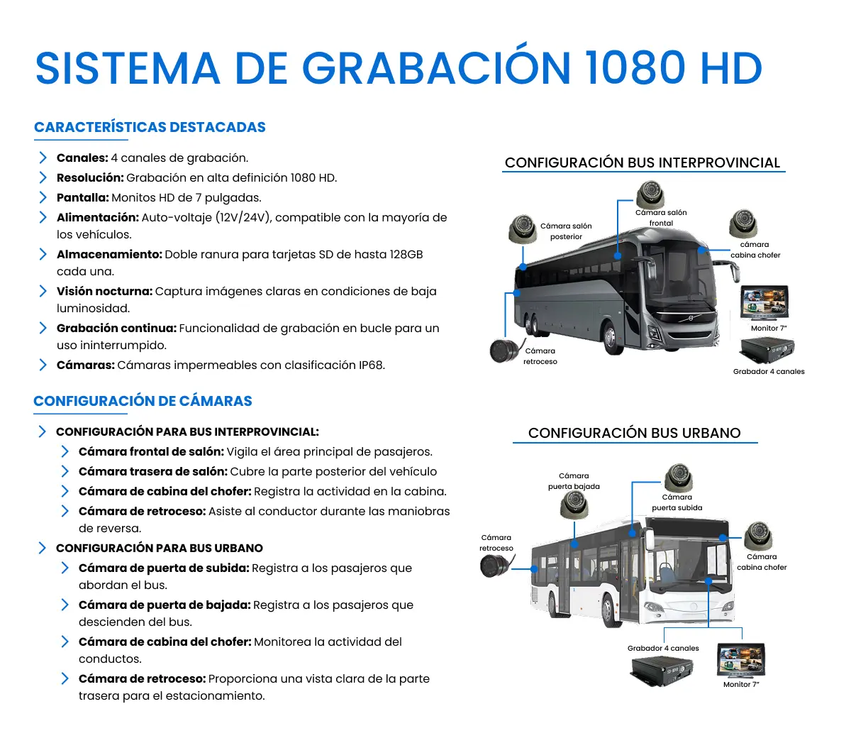 Grabación en alta definición y seguridad avanzada – Sistema DVR 1080P HD. Ideal para buses y vehículos que requieren control visual completo y respaldo de seguridad.