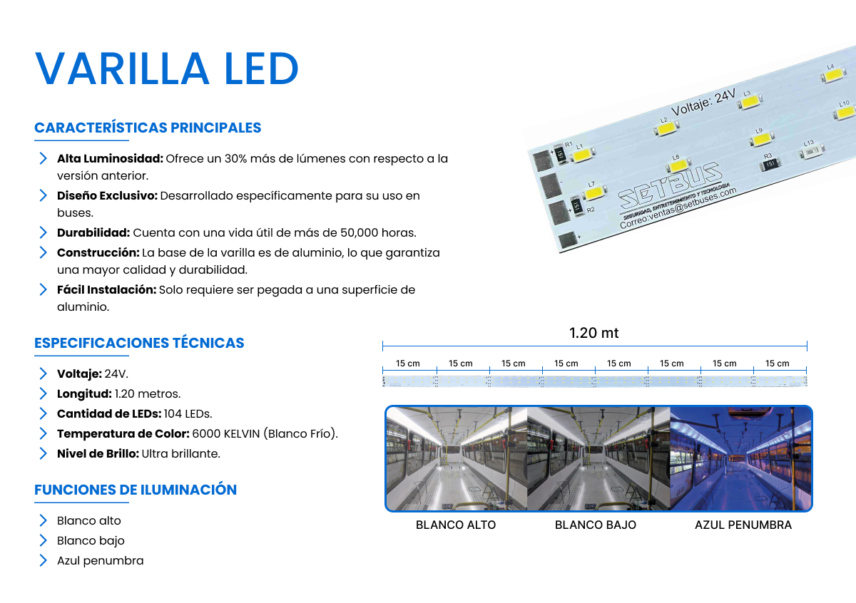 Iluminación lineal y eficiente – Varilla LED ideal para techos y cabinas de buses, minivans y vehículos. Aporta luz uniforme, bajo consumo y diseño delgado para fácil instalación.