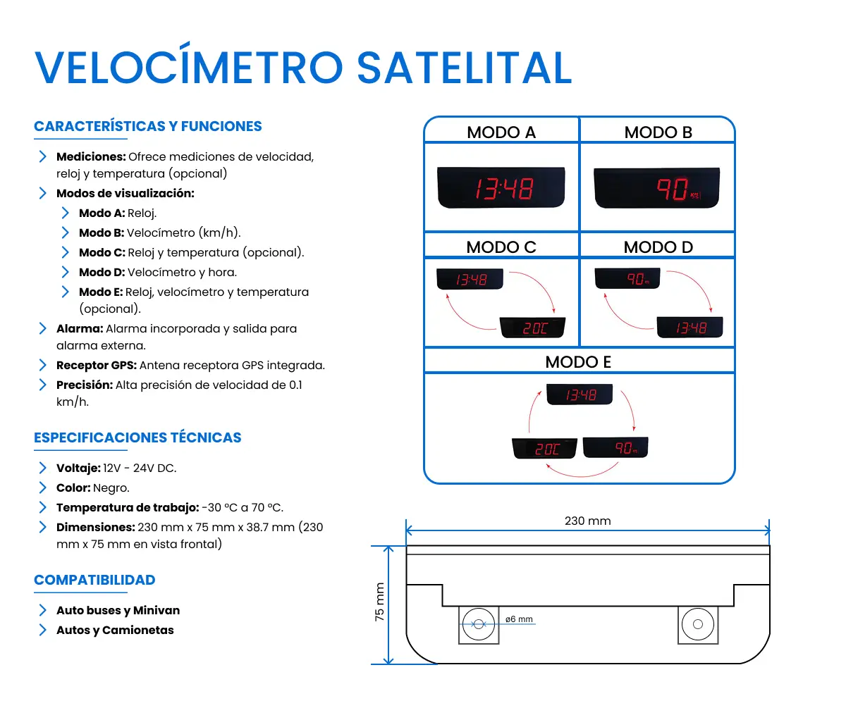 Precisión satelital en velocidad y control – Velocímetro digital con GPS, reloj y medidor de temperatura. Incluye antena satelital y alarma de sobrevelocidad. Compatible con sistemas de 12V y 24V.